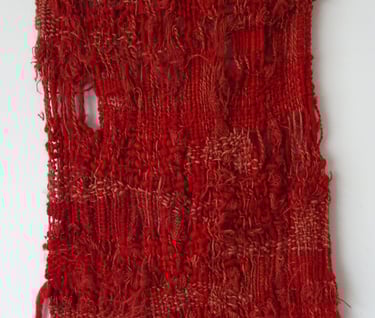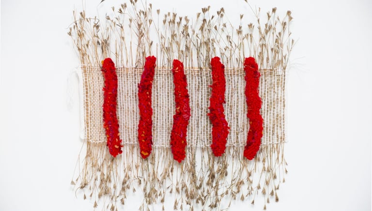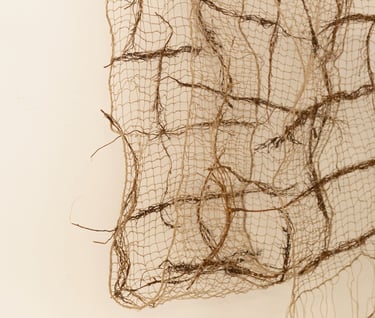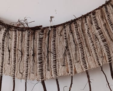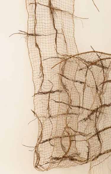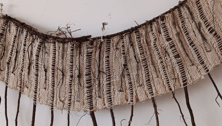 Nu probeer ik verder te gaan door te experimenteren met natuurlijke vezels als vlas, hennep en jute en natuurlijke materialen als takjes, wortels en planten. Werk dat in de ruimte aanwezig is.