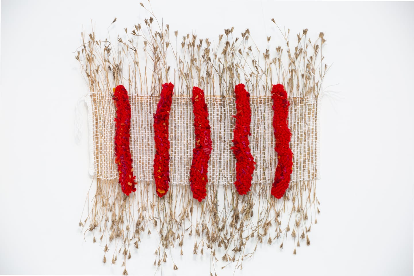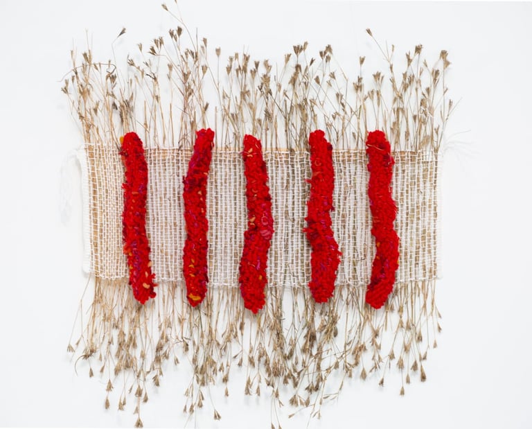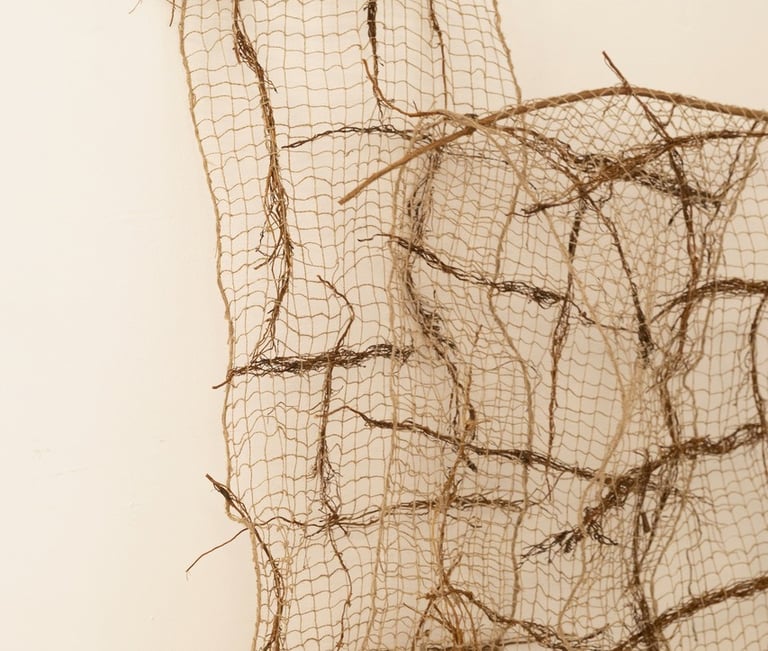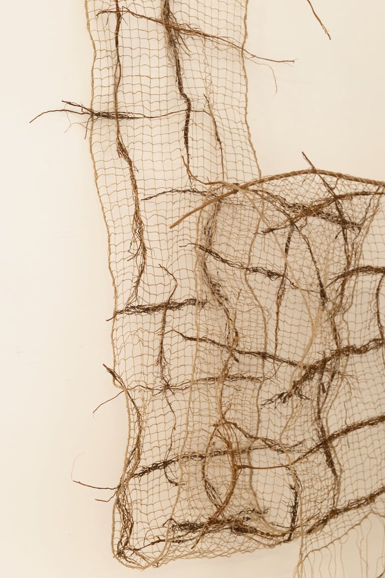 Nu probeer ik verder te gaan door te experimenteren met natuurlijke vezels als vlas, hennep en jute en natuurlijke materialen als takjes, wortels en planten. Werk dat in de ruimte aanwezig is.